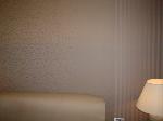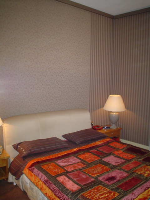 Con due tessuti in coordinato è stato creato questo motivo dietro al letto e all'ingresso della camera da letto con la tecnica della "tappezzeria tesata".